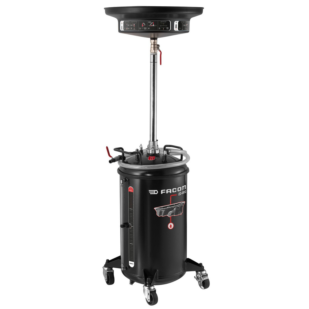 Récupérateur d'huile pour vidange par gravité - cuve 80 litres - hauteur de 1,14 à 1,68 m - grille anti-projection - 4 roues orientables - jauge de niveau - vidange cuve par air comprimé équipée valve de sécurité - FACOM OD.80GPF