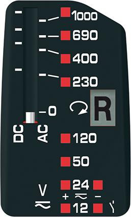 Applications : pour le contrôle professionnel des tensions continues et alternatives ainsi que de la direction du champ magnétique rotatif pour le contrôle de phases et de polarité avec déclenchement délibéré de l'interrupteur différentiel.